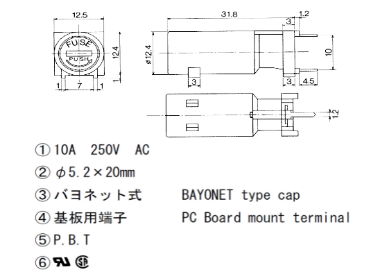 5*20 PCB板安裝保險絲座 MF-561 UL CSA 10A250V